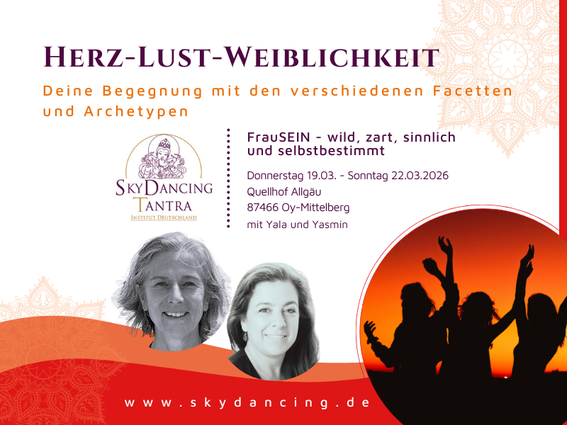 In einem geschützten Raum lernst du dich tiefer in verschiedenen Facetten kennen und annehmen. Mit intensiven Atem-Übungen, achtsamer Körperarbeit, tantrischen Übungen, Ritualen und Tanz kannst Du deinen physischen und feinstofflichen Körper öffnen und die Schätze deiner Erfahrungen würdigen. Du kannst alte Muster loslassen und deine ureigene Kraft entfalten. Wir ehren die Früchte unserer inneren und äußeren Prozesse – und zeigen uns in voller Schönheit, Reife und Stärke.